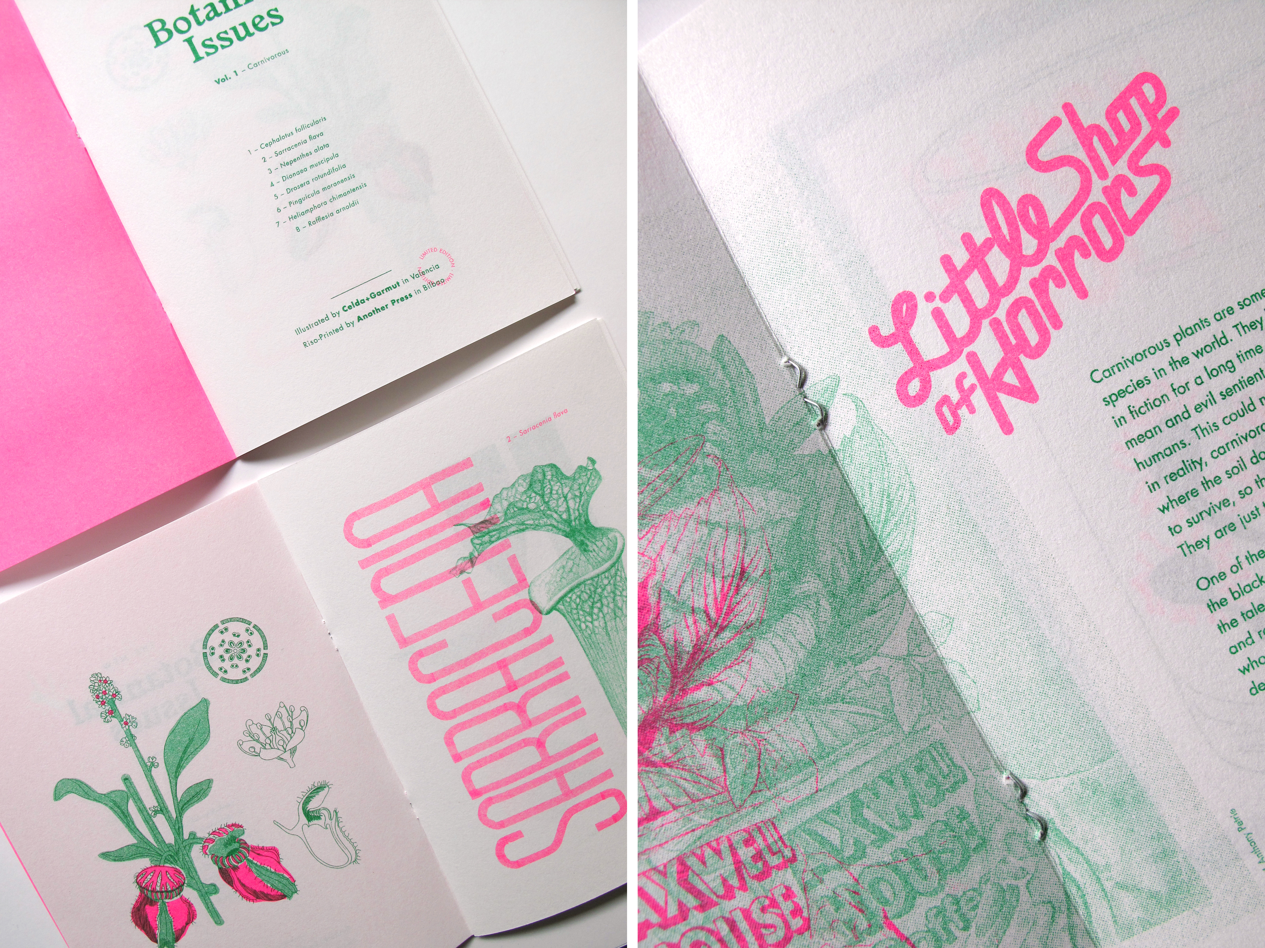 The New Botanical Issues Vol. 1 — Carnivorous is a selfpublished fanzine project with reminiscences of ancient botanical magazines as “Curtis’s Botanical Magazine” from XVIII century, and the beginning of classification and botanical nomenclature. We opted for carnivorous plants because of the curiosity they awaken. Risograph(Riso)-printed in Another Press (Bilbao, Spain) with green an fluo pink inks. Paper: Munken Lynx Rough.